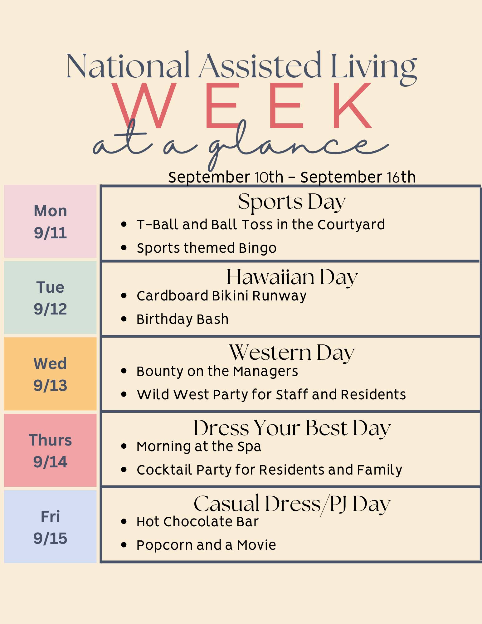 We celebrated National Assisted Living Week in September. Each day we had a different theme, staff, management, and residents all had fun getting in the spirit and having fun together!